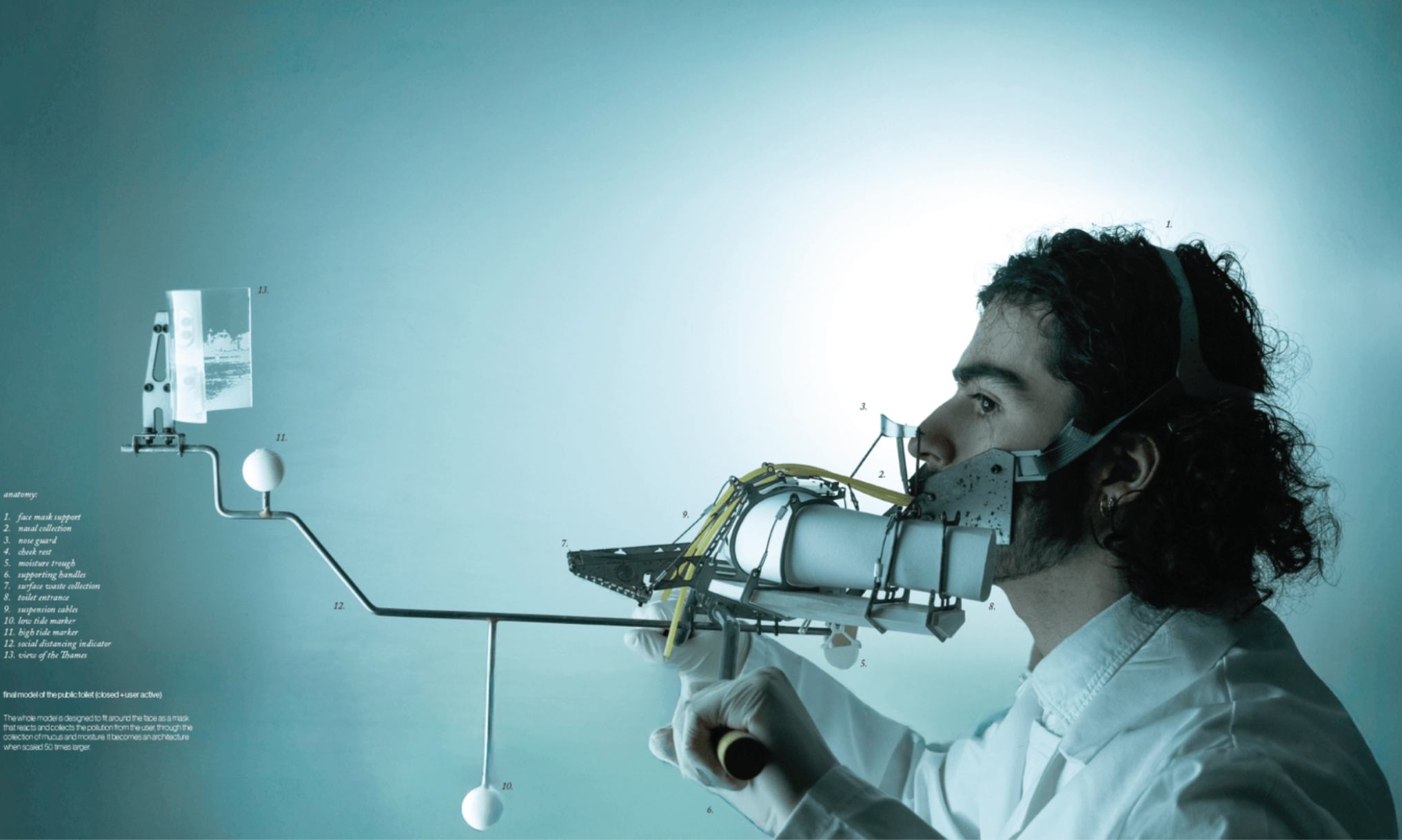 The final model outcome is designed as such so that it becomes a wearable face mask at 1 to 50 scale, but a usable public toilet at full scale, both showing the dynamic reciprocity of health