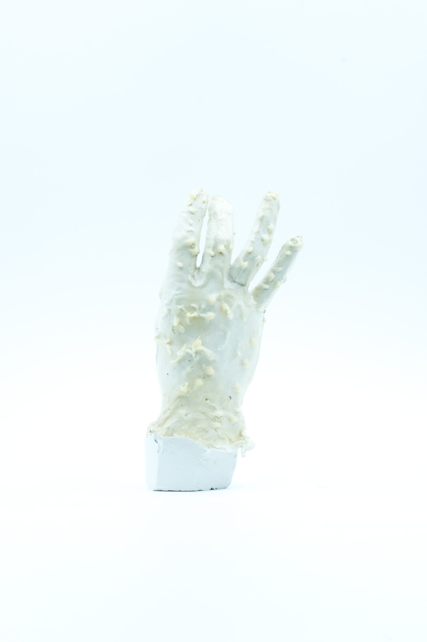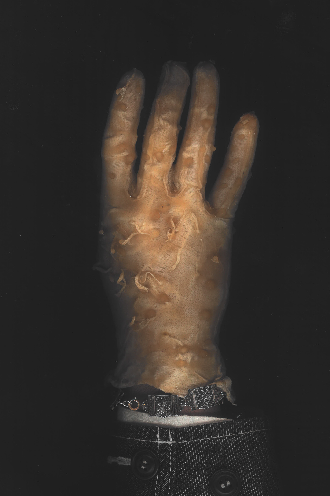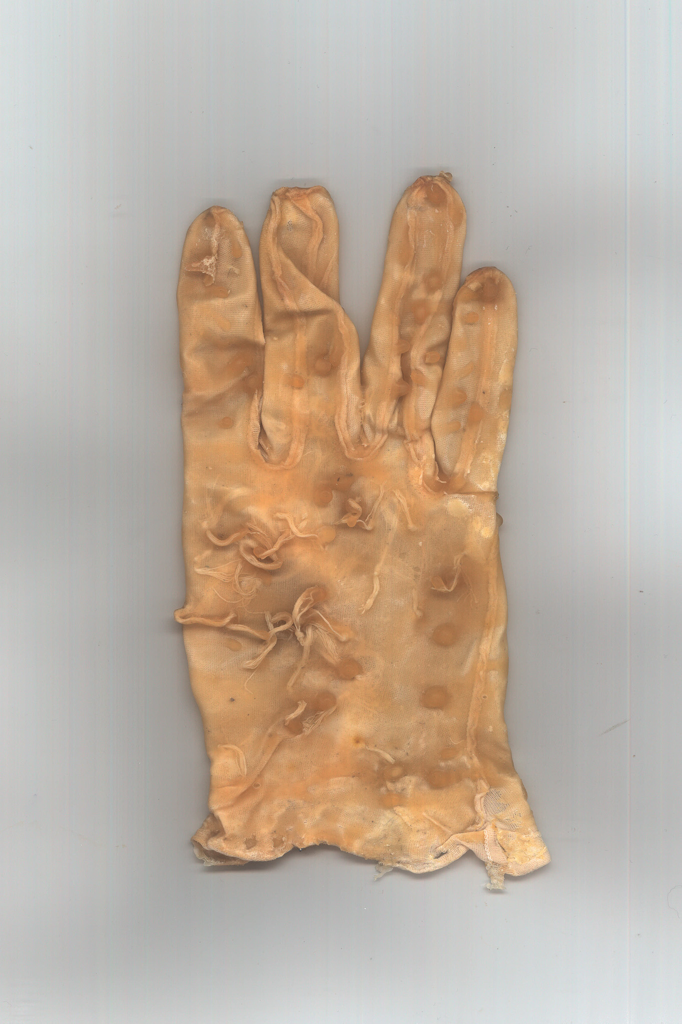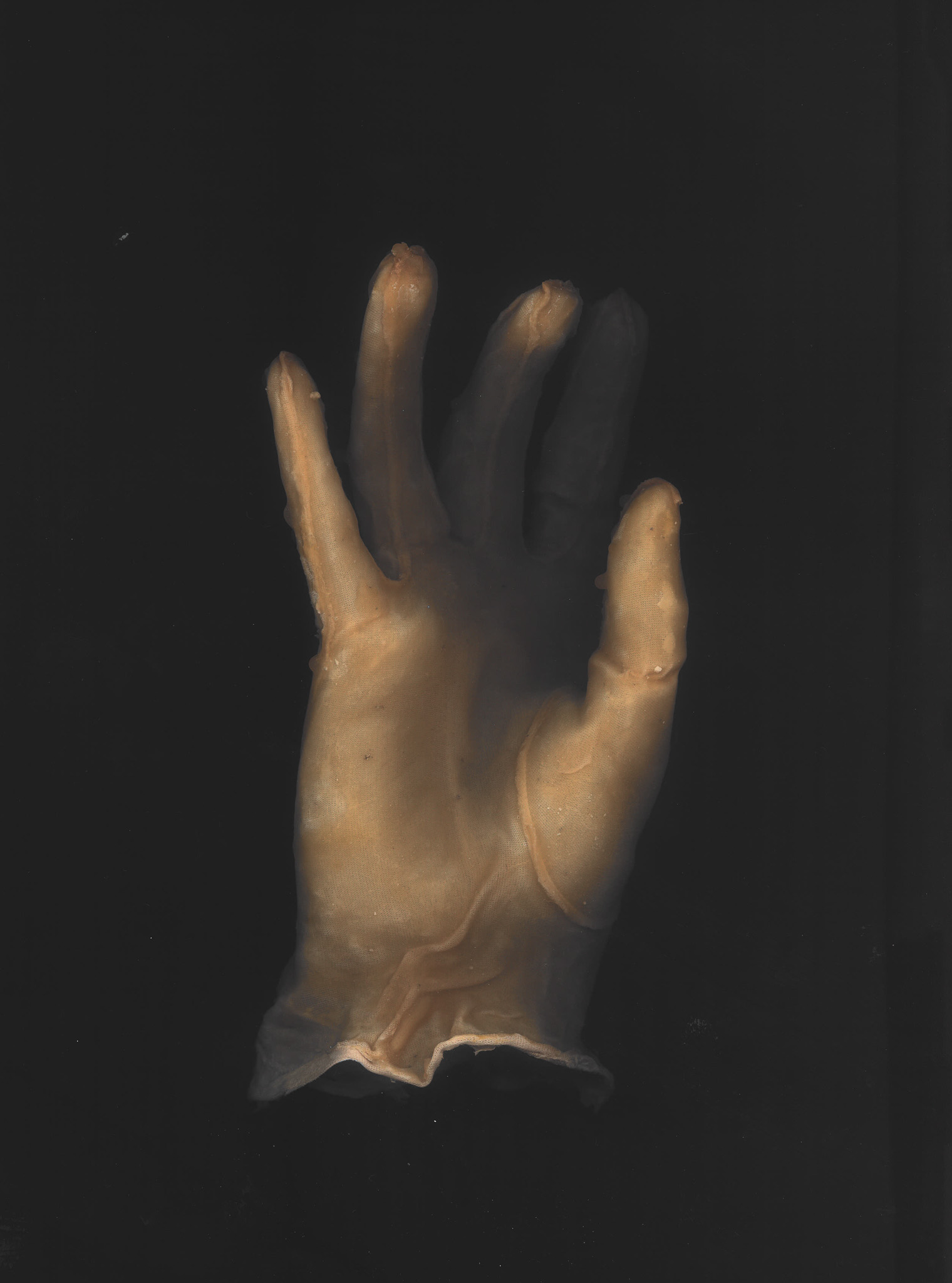 001 Latex gloves have always been a symbol of a controlled environment,, protection of the hand in a stable chemical prison, the apparel of the hospital and the surgeon. I deviate these forms into something that its itself biological, taking inspiration from caul fat (as crepinettes) to create a hand that becomes distorted and fleshy