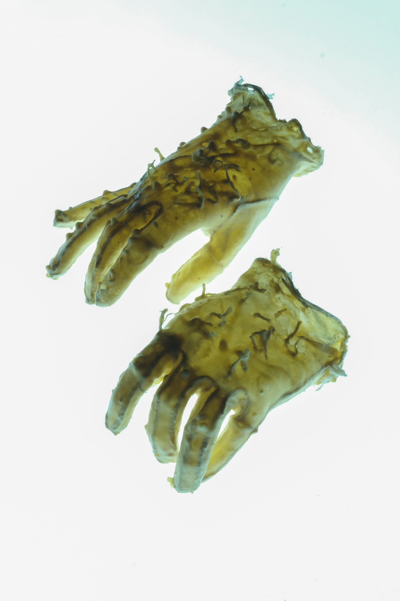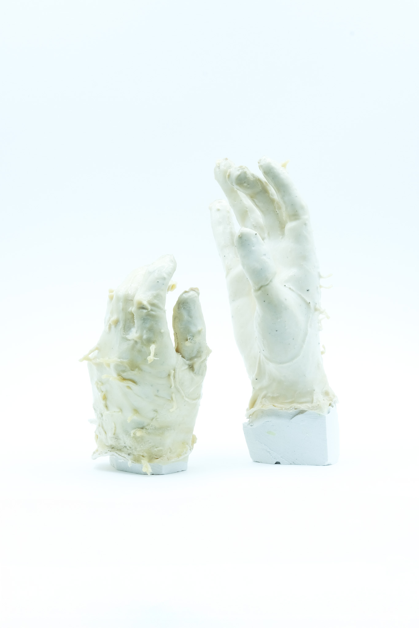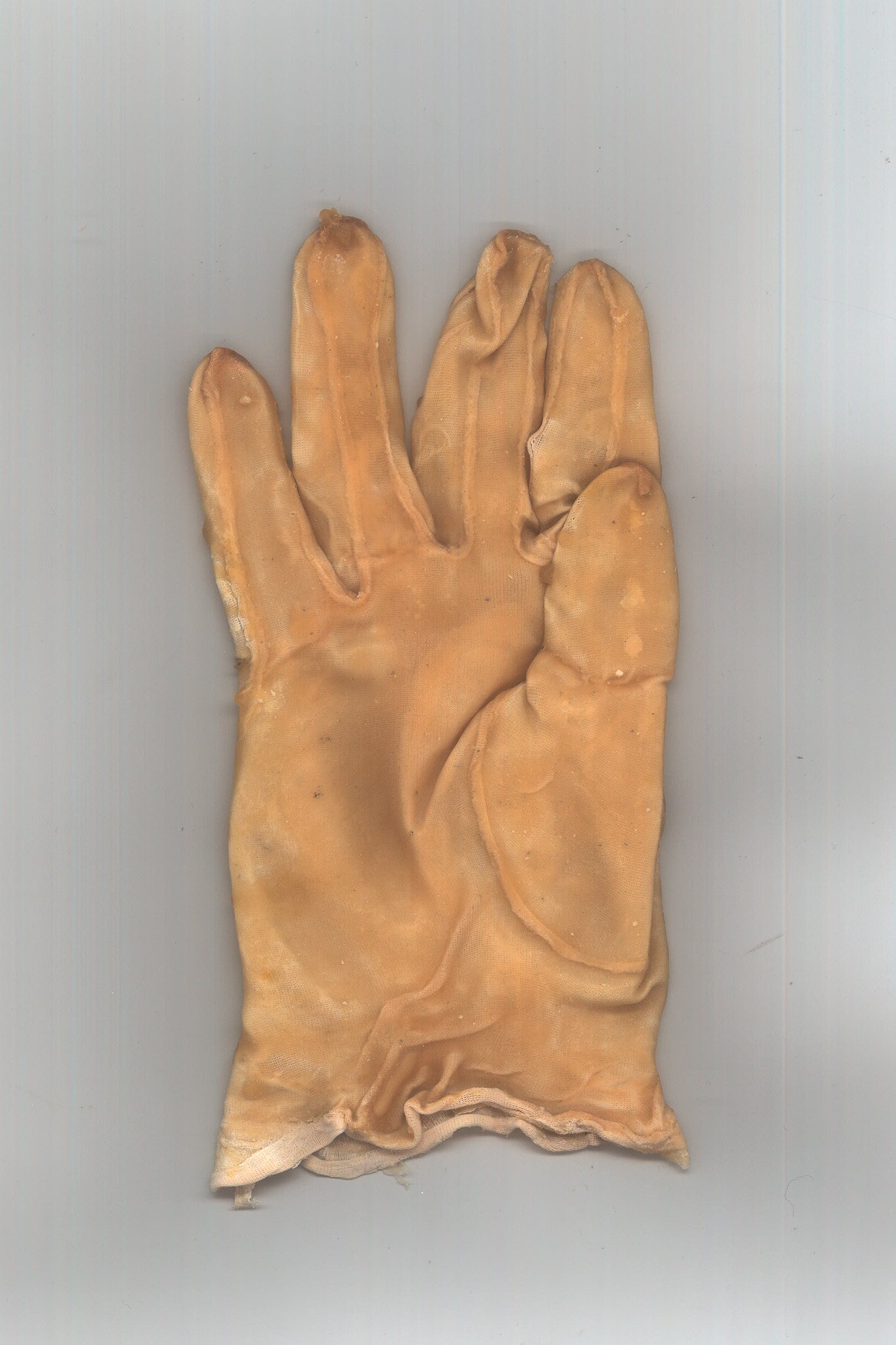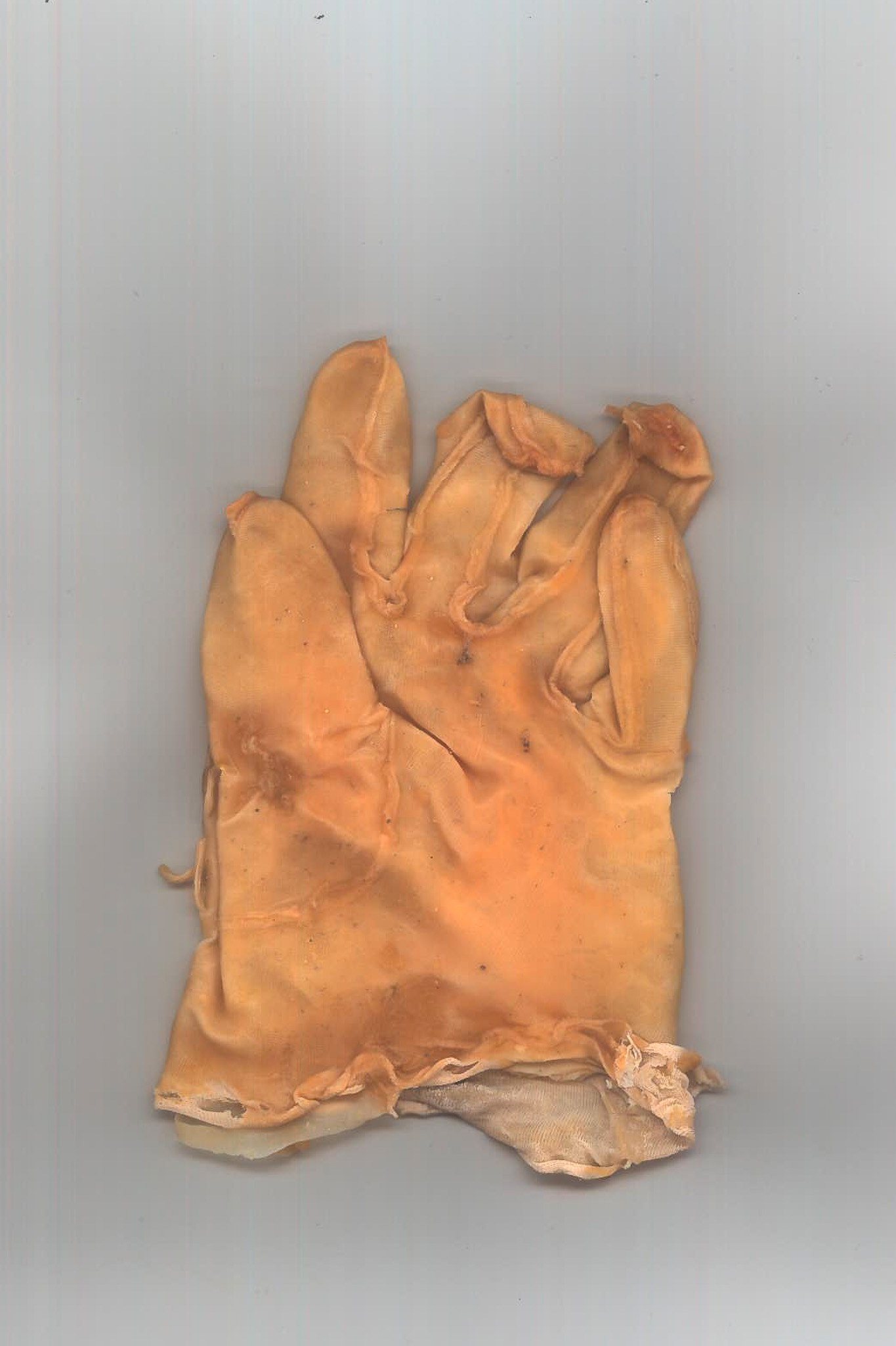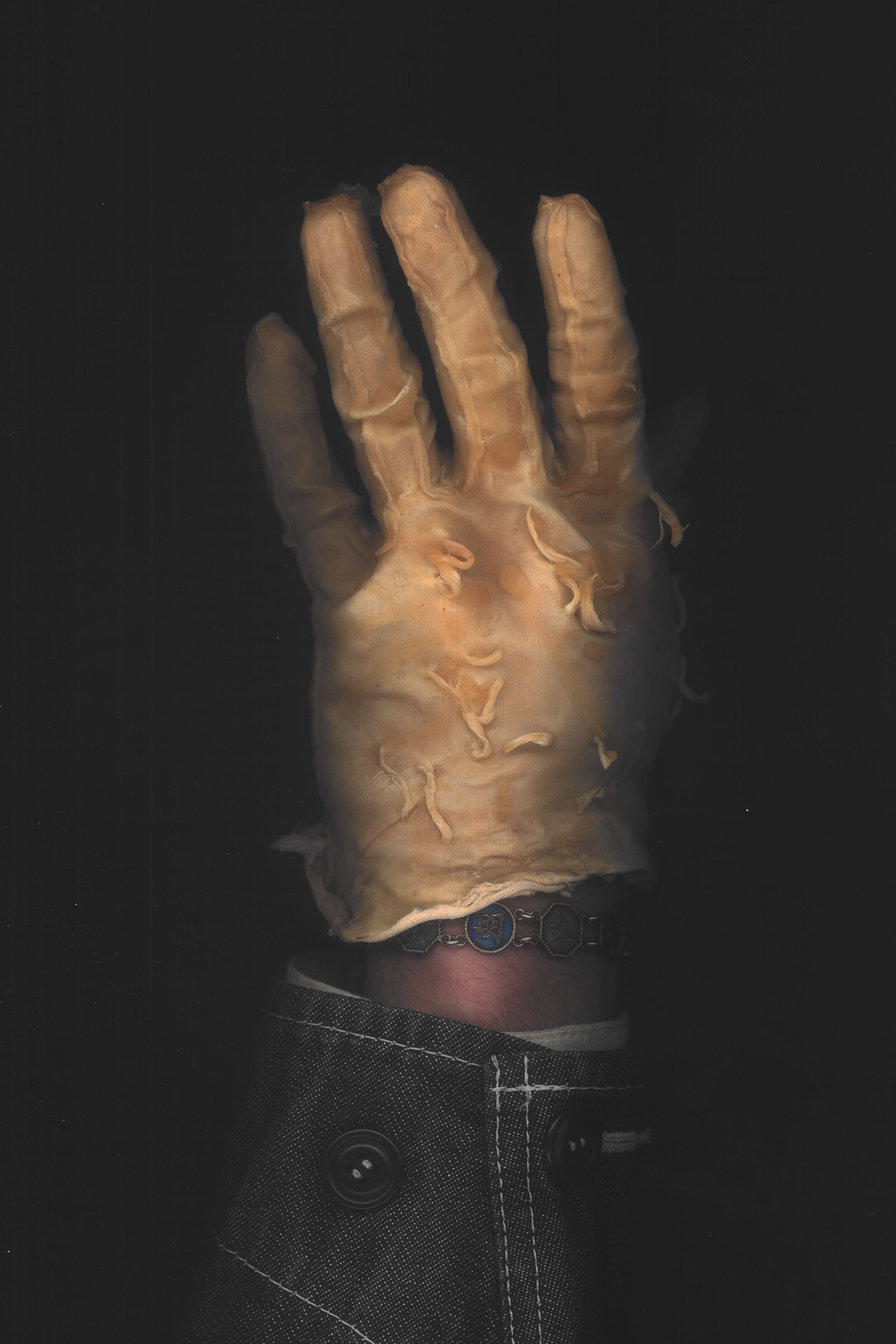 001 Latex gloves have always been a symbol of a controlled environment,, protection of the hand in a stable chemical prison, the apparel of the hospital and the surgeon. I deviate these forms into something that its itself biological, taking inspiration from caul fat (as crepinettes) to create a hand that becomes distorted and fleshy