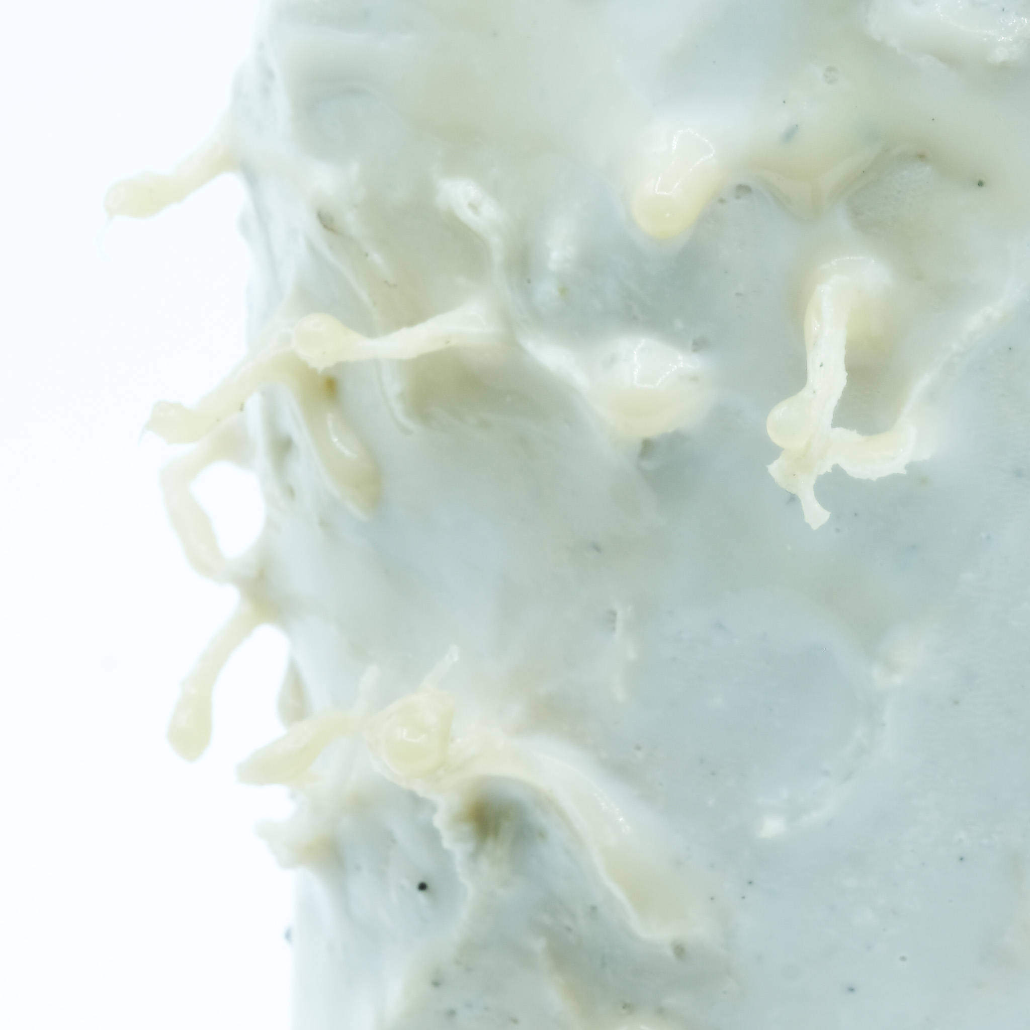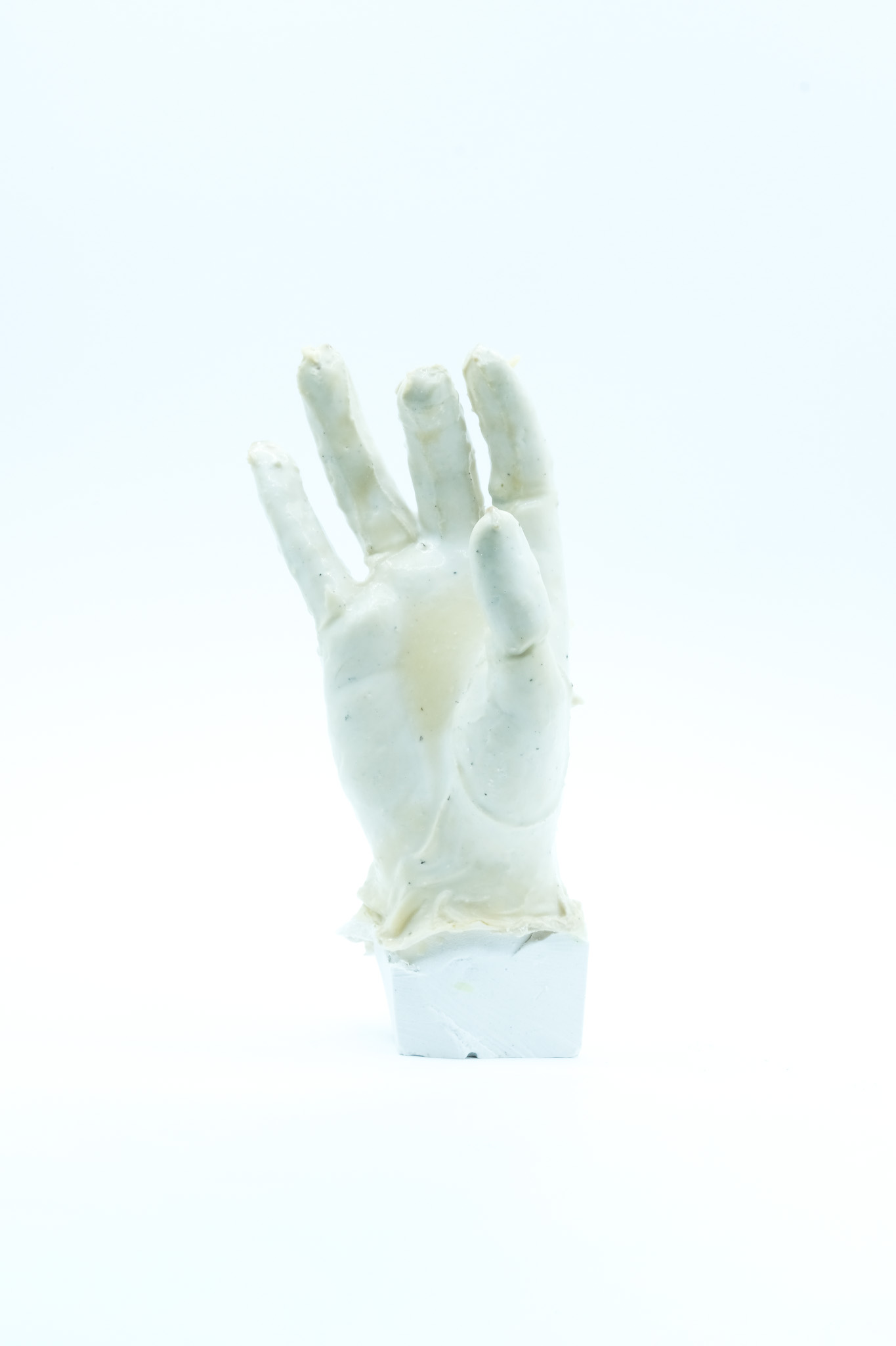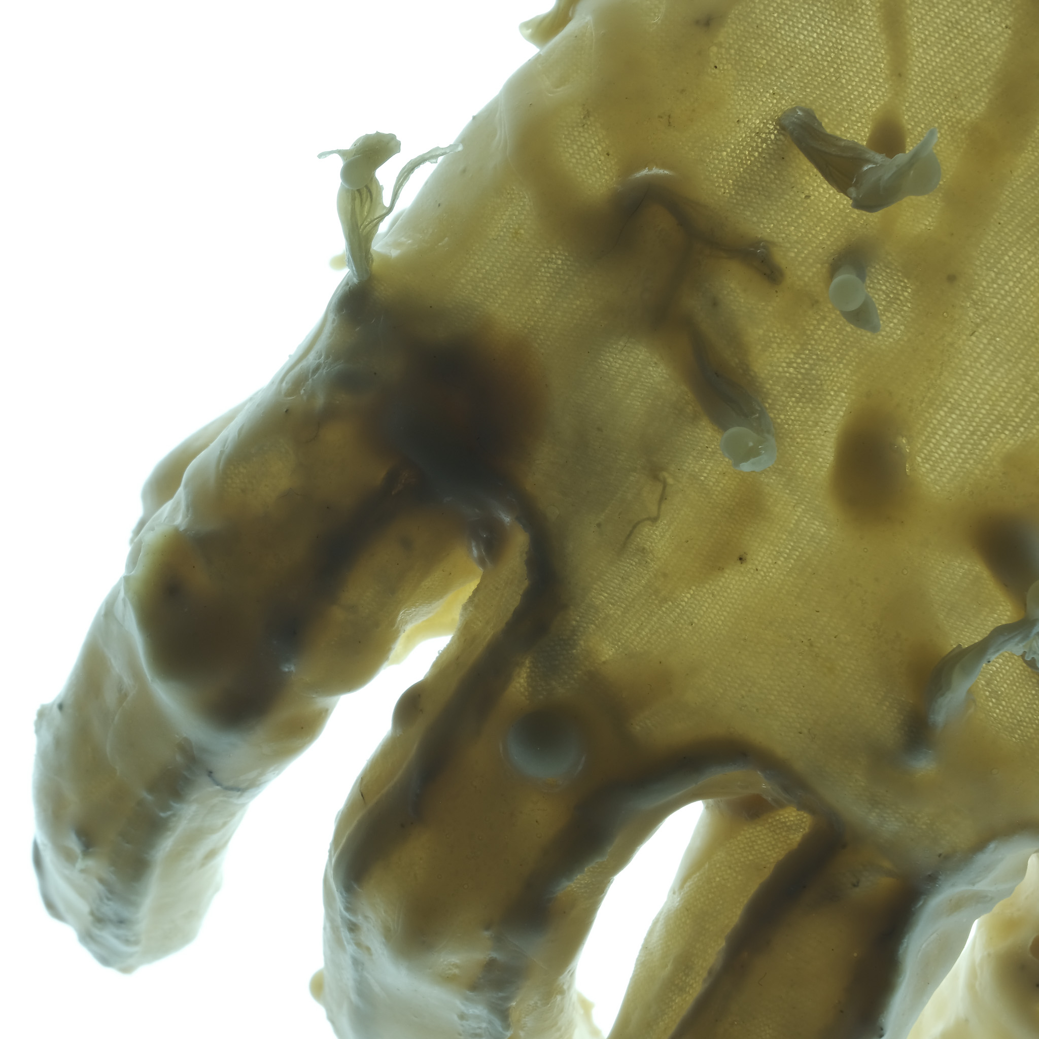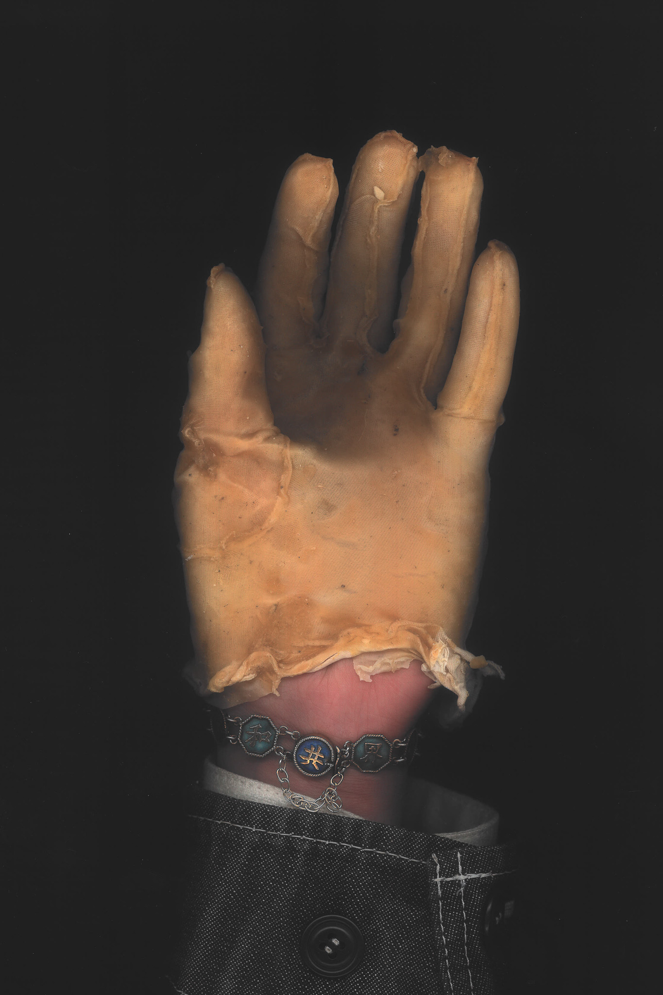 001 Latex gloves have always been a symbol of a controlled environment,, protection of the hand in a stable chemical prison, the apparel of the hospital and the surgeon. I deviate these forms into something that its itself biological, taking inspiration from caul fat (as crepinettes) to create a hand that becomes distorted and fleshy
