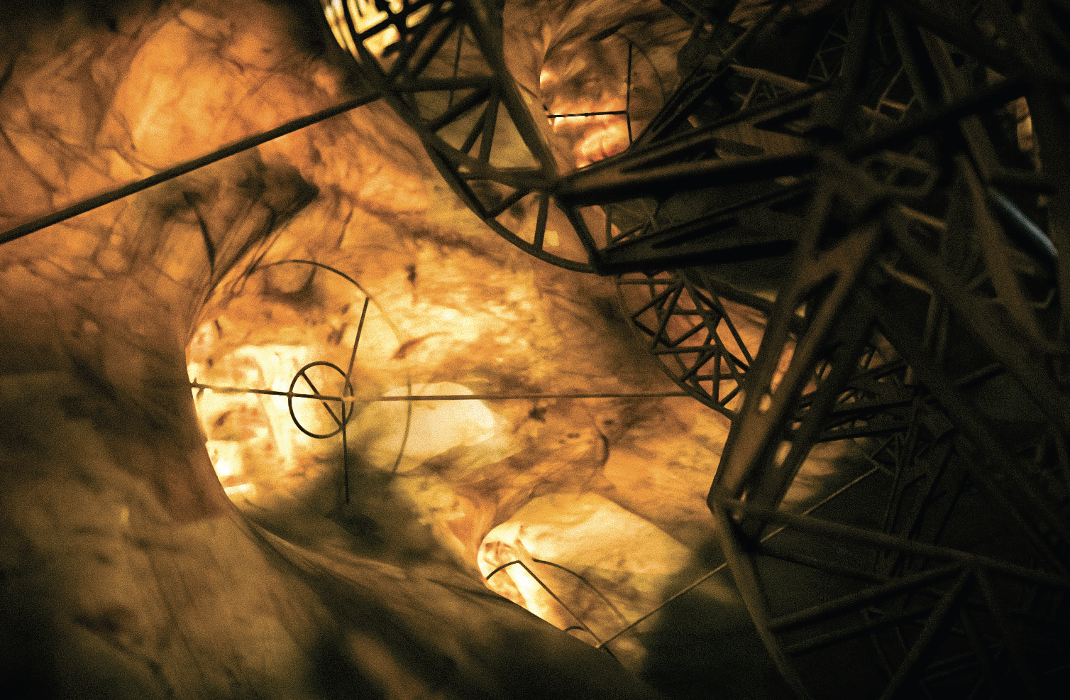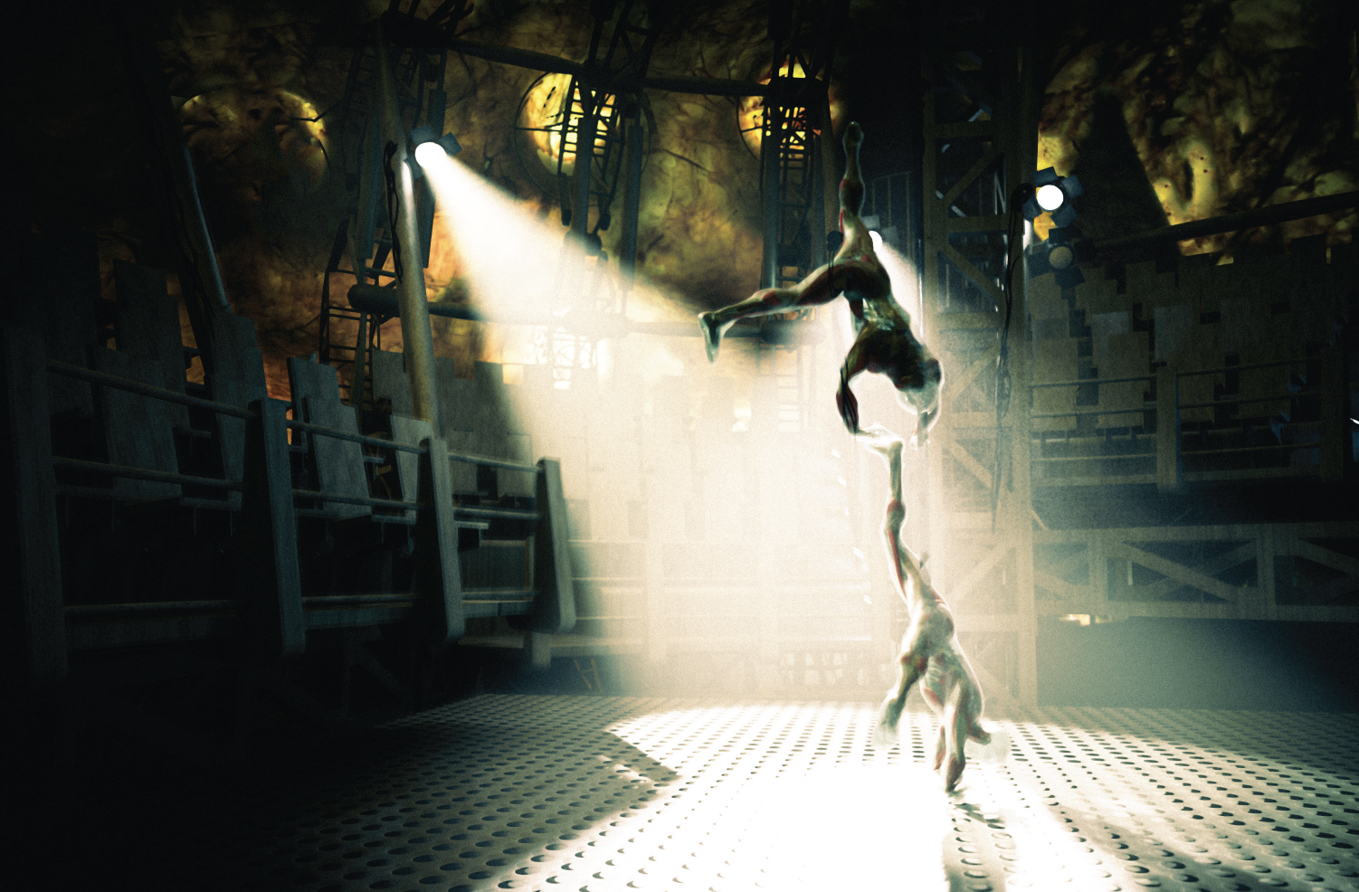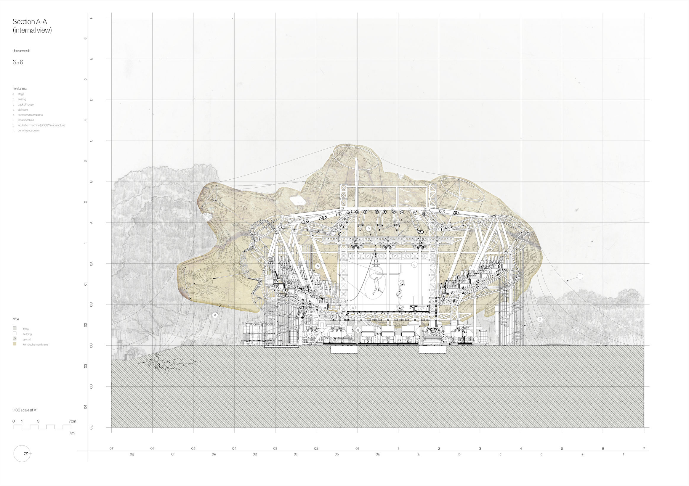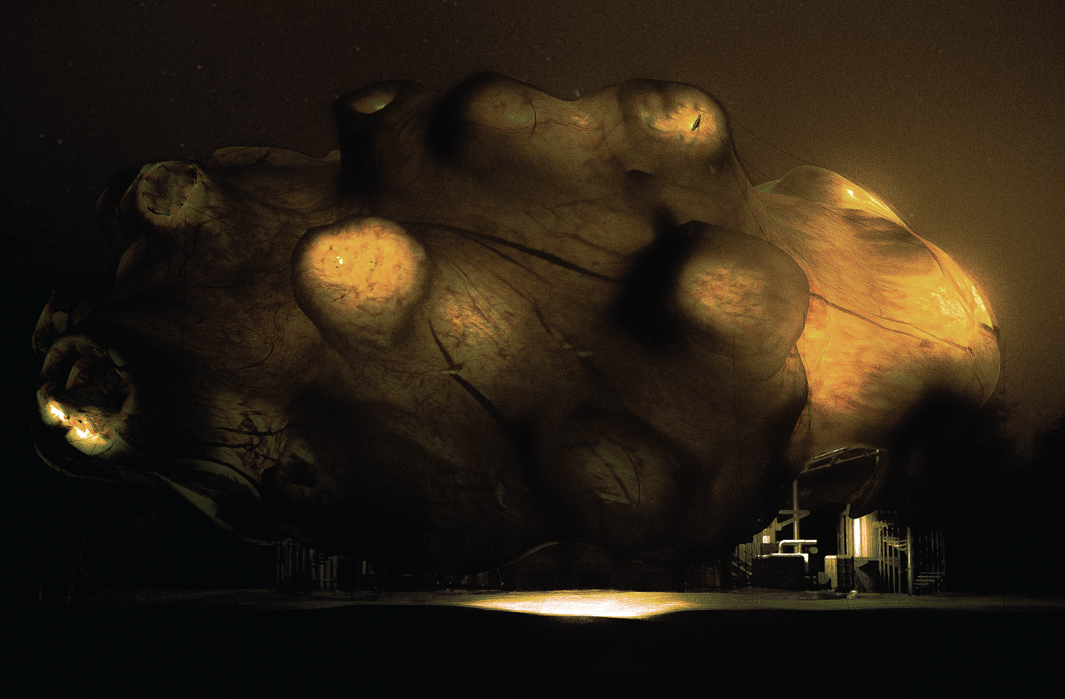 003 Over time, the metal scaffolding becomes more and more concealed by the growing bacterial film. It is slowly transformed into a golden lantern, set against the River Lea. The dried skin houses contemporary circus performance, a way of celebrating both the fleshy material of kombucha, the dynamism of the human body and how it moves within the space. At night, a harsh spotlight projects the shadows of the performers onto the flesh of the occluded building.